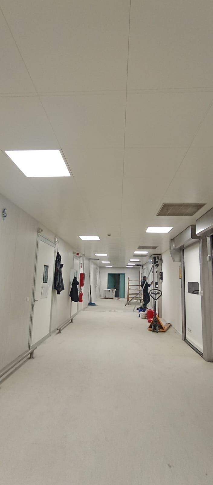 Vengono impiegati materiali specifici come pareti divisorie, controsoffitti, porte e pavimentazioni in PVC, progettati per garantire sanificabilità e resistenza.